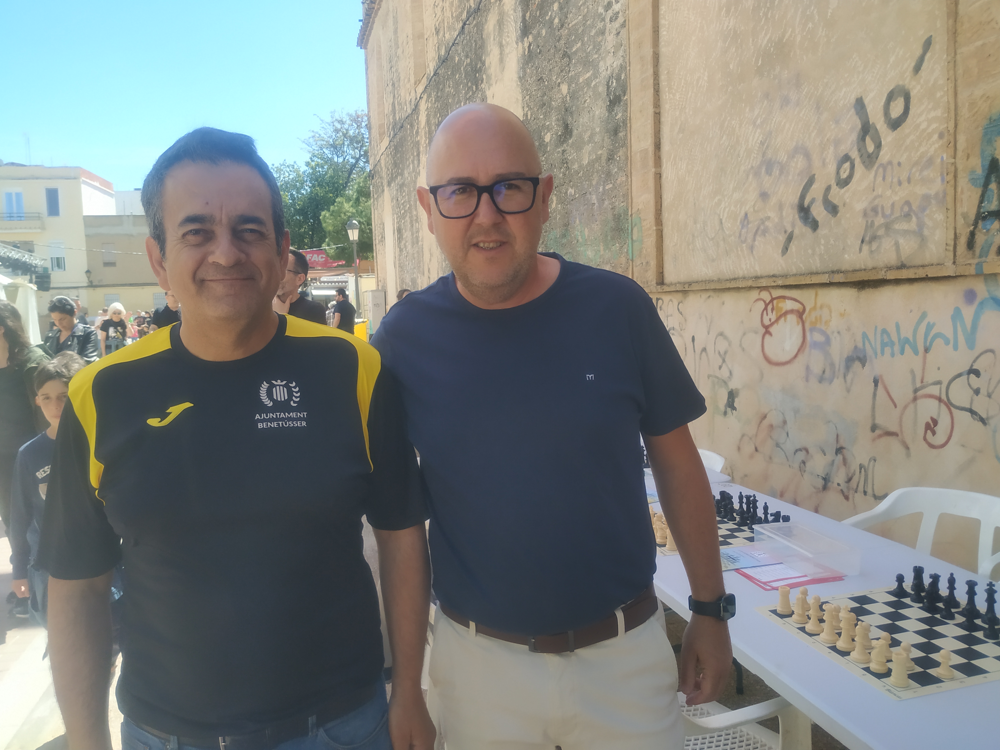 El Club de ajedrez Benetússer tuvo representación en la FAC 2025 para promocionar el Club disponiendo de tableros y piezas, para que todos los aficionados al ajedrez pudiesen jugar algunas partidas amistosas. Tuvimos la presencia del Concejal de deportes Rafael del Rio, la cual agradecemos. En la imagen junto al Secretario del Club de ajedrez Francisco Medina.